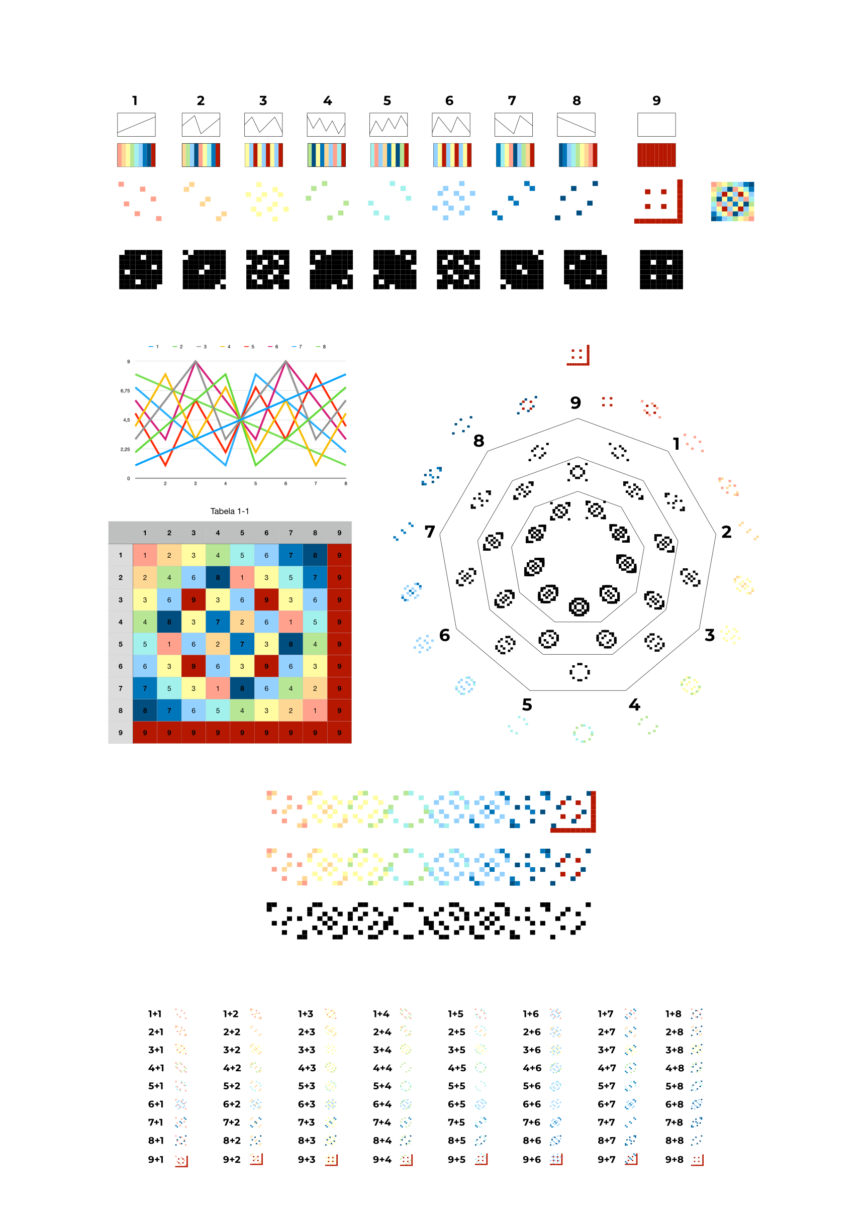 Este estudo explora a beleza e a complexidade dos números através da multiplicação de eixos num quadro 9×9, onde o resultado é transformado num número unitário pela soma dos seus algarismos. Esta metodologia cria um “mosaico” visual, onde cada número recebe uma cor, formando padrões únicos e sequências numéricas que se interligam de forma inversa entre si, como 1 e 8, ou 7 e 2.